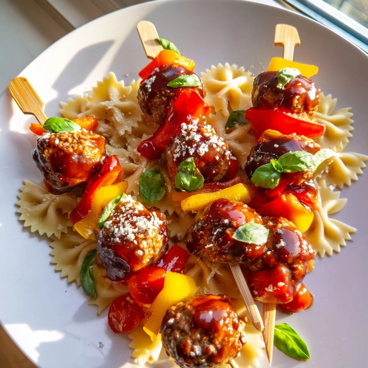 These festive skewers bring together al dente bowtie pasta, savory cocktail meatballs, and vibrant vegetables in a fun handheld format. The meatballs get coated in a sweet and tangy barbecue glaze, while fresh basil and Parmesan add aromatic Italian flair. Perfect for gatherings, each skewer offers satisfying bites of pasta, tender meat, and crisp vegetables that guests can grab and enjoy.